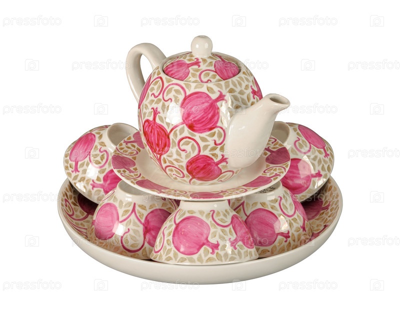 Винтажный восточный керамический чайник и чашки на белом фоне