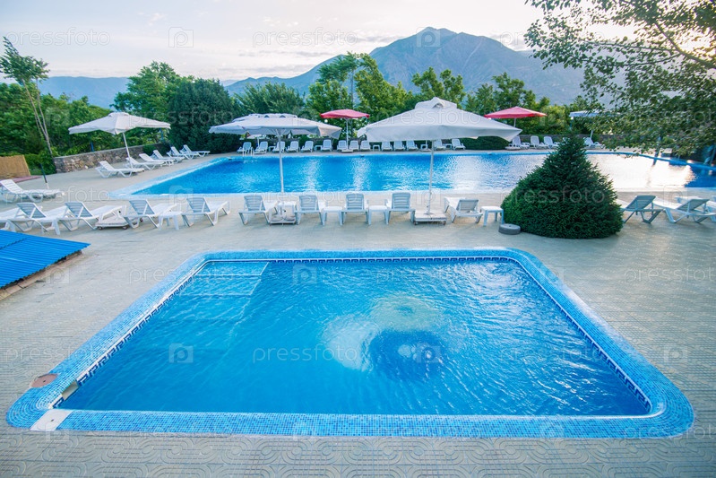 Пара голубых бассейнов с зонтиками и стульями на курорте в горах Средней Азии