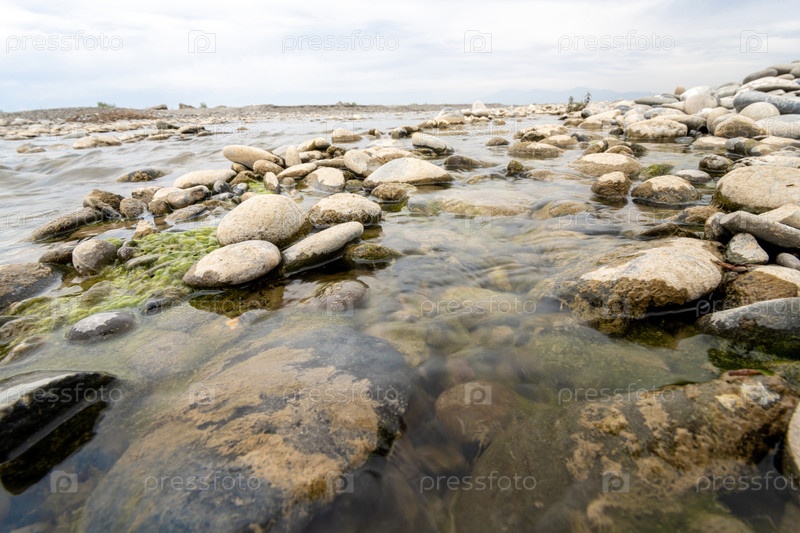 Крупный план красивых больших и маленьких мокрых камней в озере в сельской местности