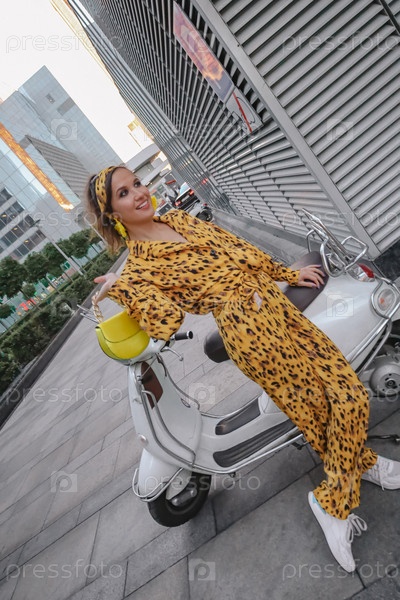 Красивый снимок женщины в желтом, поднимающей каблук, и Москва-Сити на заднем плане