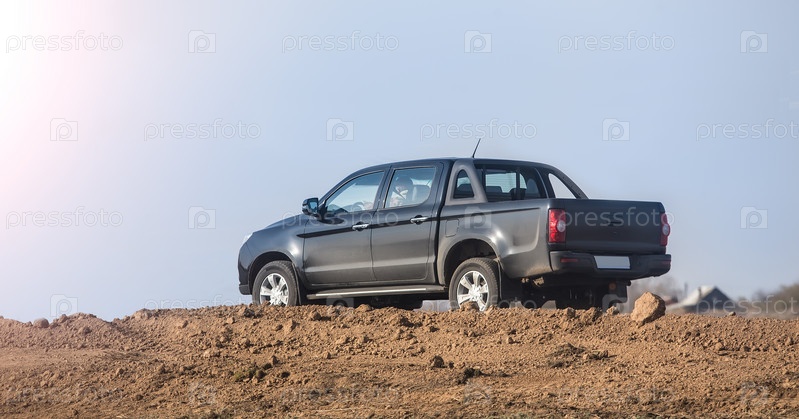 Пикап движется по грунтовой дороге