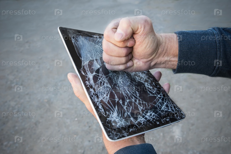Мужской кулак разбивает экран планшета