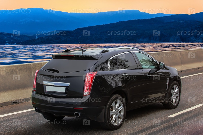 Кроссовер движется по дороге вдоль морского побережья в горы