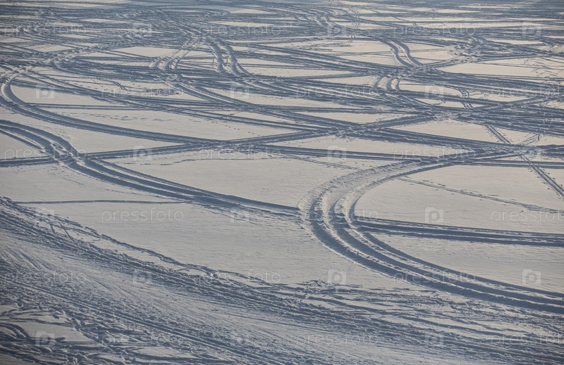 Следы лыж и снегоходов на поверхности зимнего озера