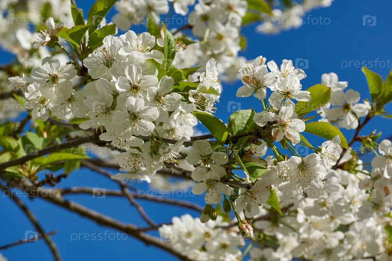 Вишневые цветы на фоне голубого неба. Вишневый цвет в саду