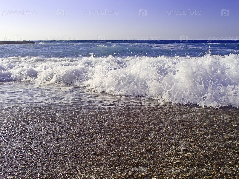 Морской прибой. Пенящаяся волна накатывает на берег. Выборочный фокус, малая глубина резкости