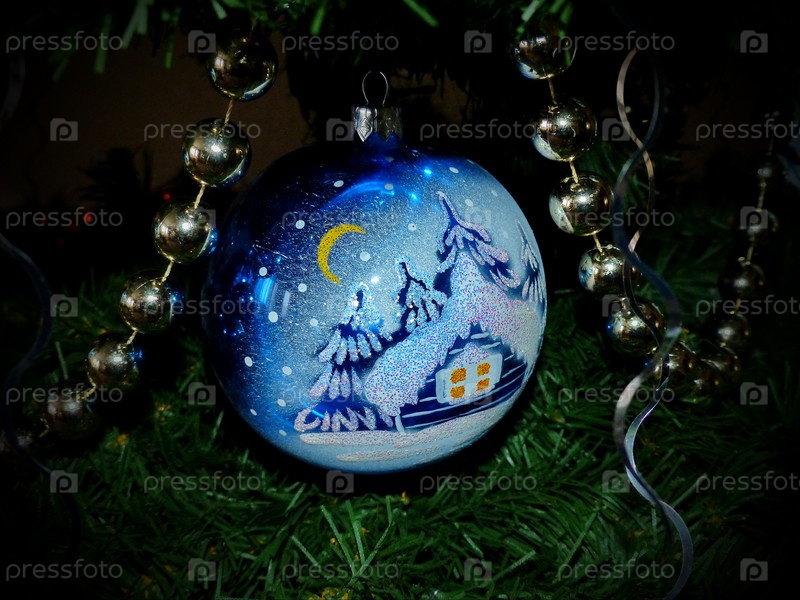 Новогодние игрушки на ветках елки. Стеклянный шар, бусы. Праздничный фон. Новый год и Рождество. Выборочный фокус