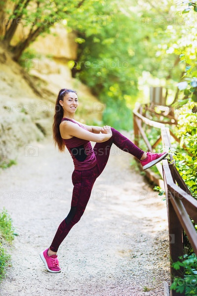 Спортивная девушка делает упражнения на растяжку на открытом воздухе в парке. Концепция на тему здорового образа жизни и спорта