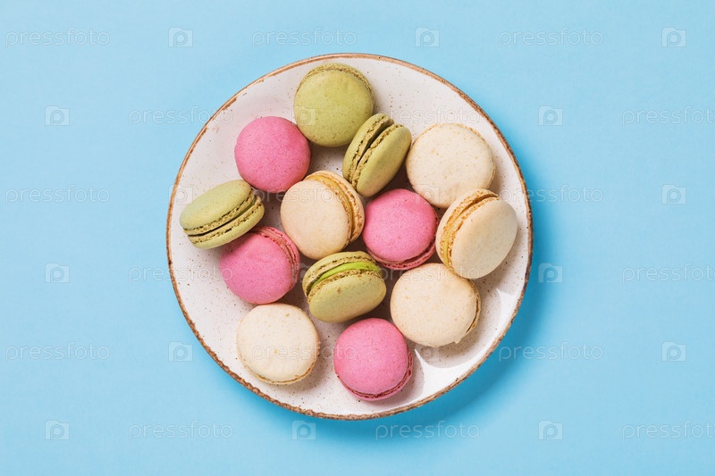 Полная тарелка различных миндальных печений на синем фоне, вид сверху