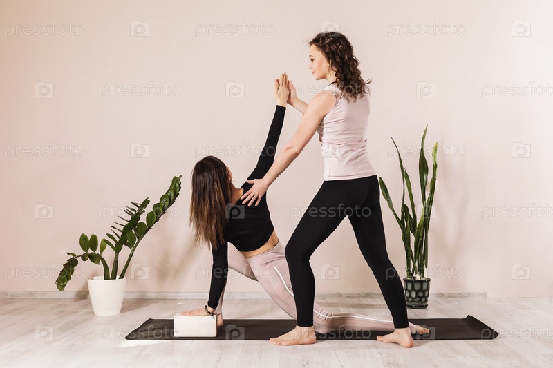 Две женщины в спортивной одежде занимаются йогой, делая низкий выпад на одной ноге с поворотом или Анджанасану или Анджанеясану (поза Полумесяца или поза молодой луны). Учитель помогает ученику