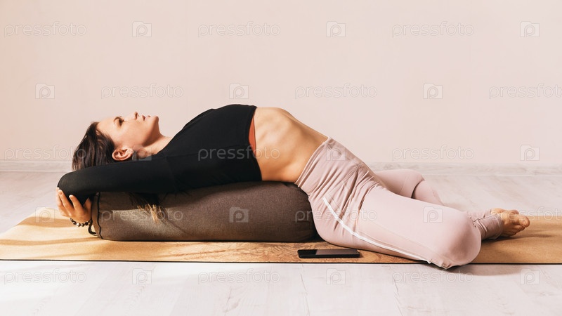 Красивая брюнетка в спортивной одежде, практикующая йогу, выполняющая упражнения Супта баддха конасана с подкладкой под спиной на гимнастическом коврике в студии