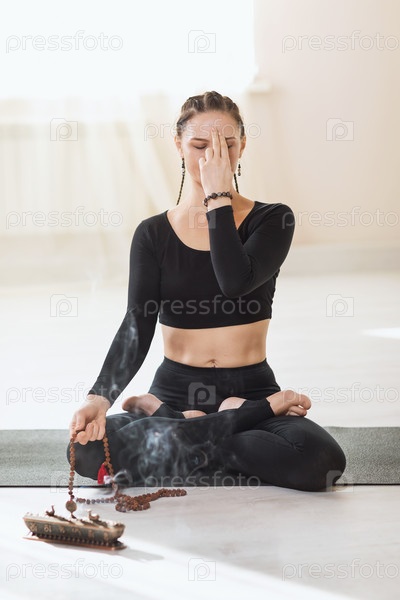 Женщина в черной спортивной одежде, практикующая йогу, сидящая на гимнастическом коврике в позе лотоса, занимается медитацией и дыхательными упражнениями пранаямы. Инструктор показывает символ мудры возле лица