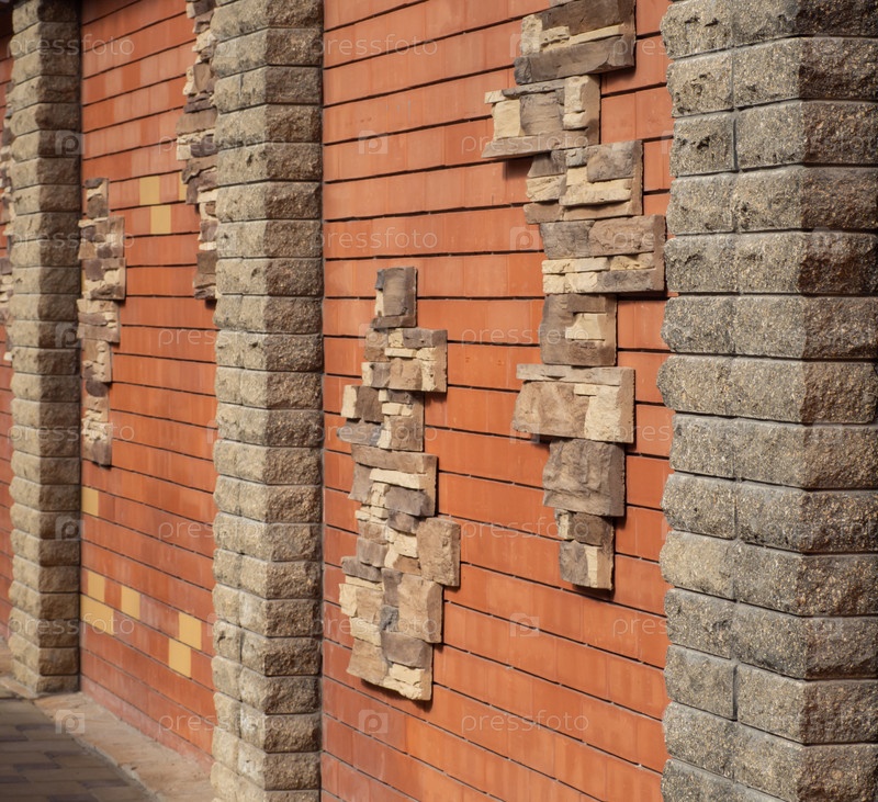 Текстура кирпичной стены. Перспективный вид текстурированной стены из красного кирпича и декоративного камня