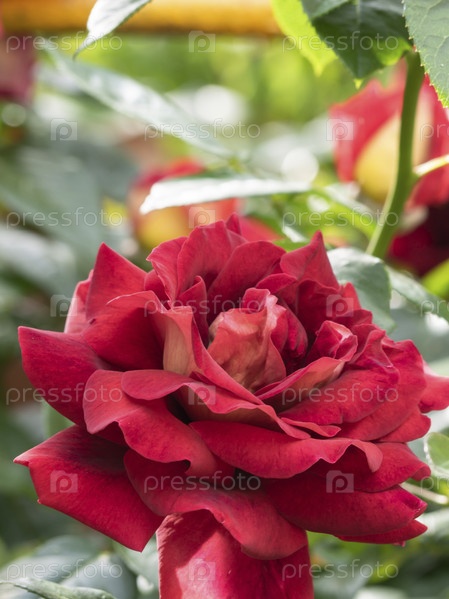 В летнем саду расцветает красивая красная роза с элегантными лепестками. Очаровательная красная роза на естественном фоне