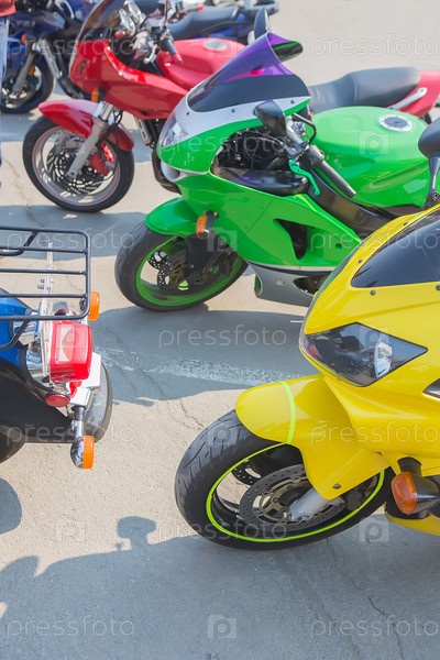Красно-зеленый и желтый мотоцикл на стоянке в ряд крупным планом