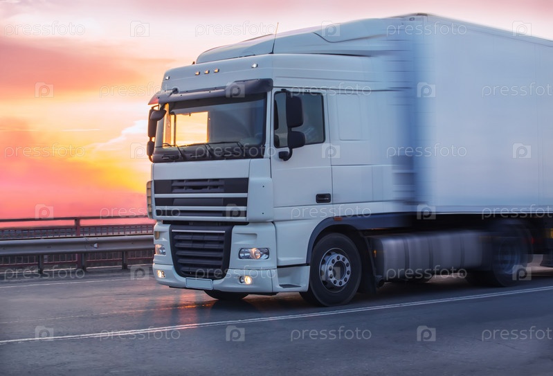 Грузовик едет по шоссе на закате