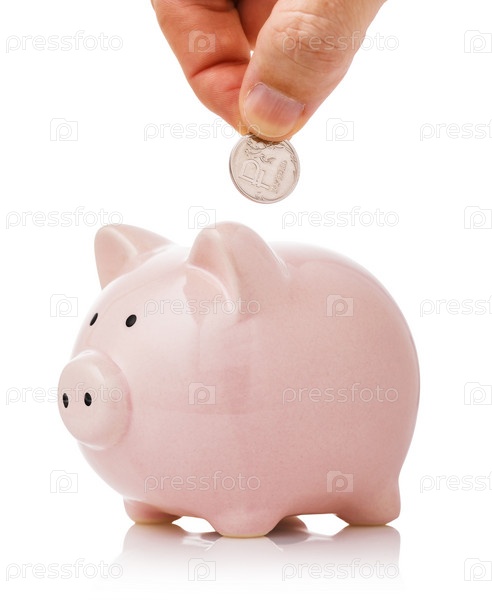 Рука кладет один рубль в копилку. Концепция на тему экономии