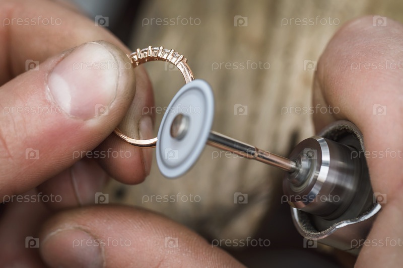 Полировка золотого кольца в ювелирной мастерской. Мастер занимается обработкой изделия