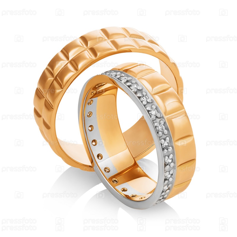 Красивая пара золотых обручальных колец с бриллиантами на белом фоне. Фотография сделана стопкой