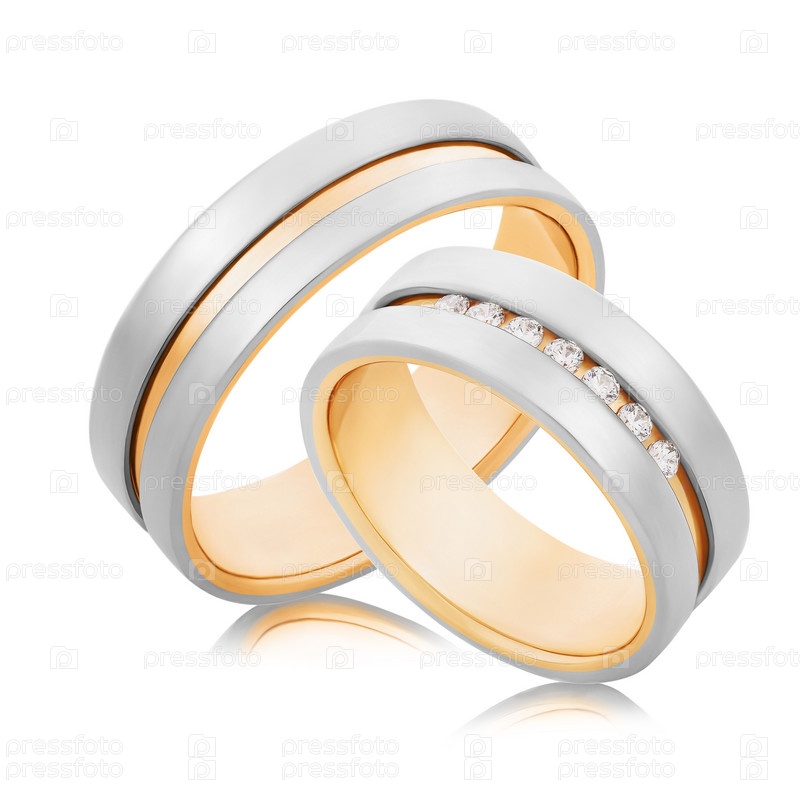 Красивая пара обручальных колец из желтого и белого золота с драгоценными камнями, изолированные. Фотография сделана стекированием