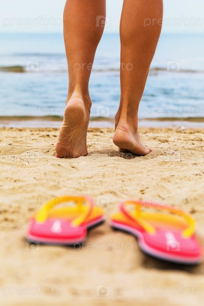 Девушка собирается купаться в море. Ноги на песке крупным планом