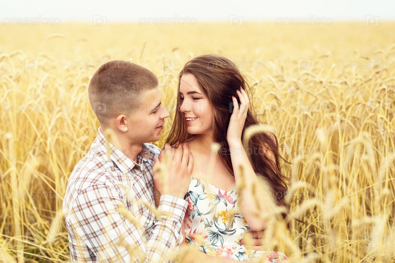 Красивая молодая пара отдыхает на пшеничном поле. Влюбленная девушка и ее парень обнимаются. Семейный отдых на природе