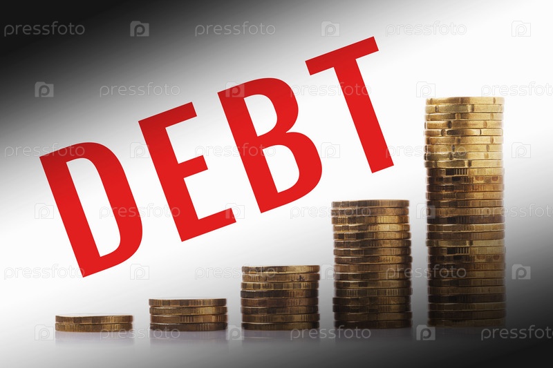 Растущий долг. Сваи монет и долг надписей. Увеличение кредитной задолженности