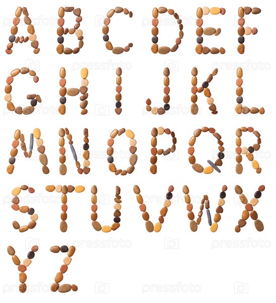 Английский алфавит из морских мелких камешков, изолированных на белом фоне