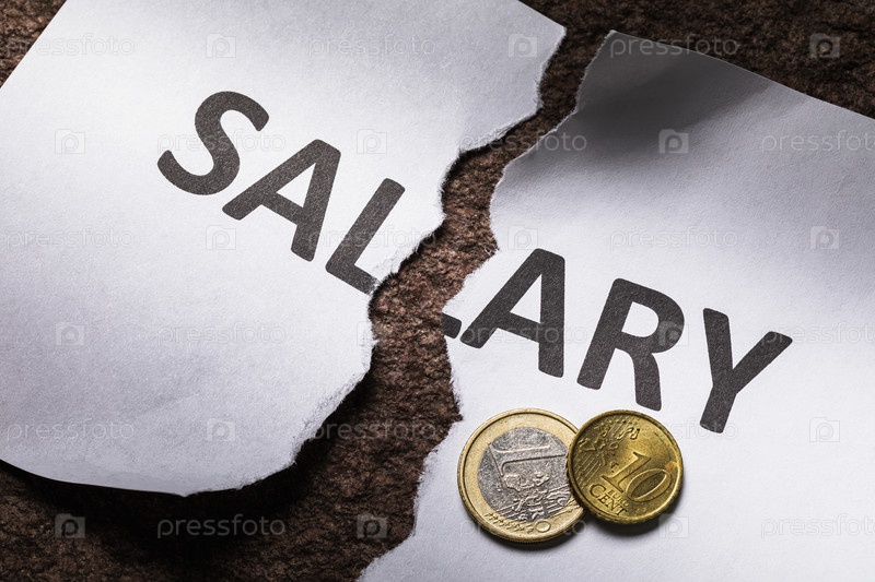 Разорванный лист бумаги со словами "зарплата", окруженный монетами. Концепция на тему финансового кризиса