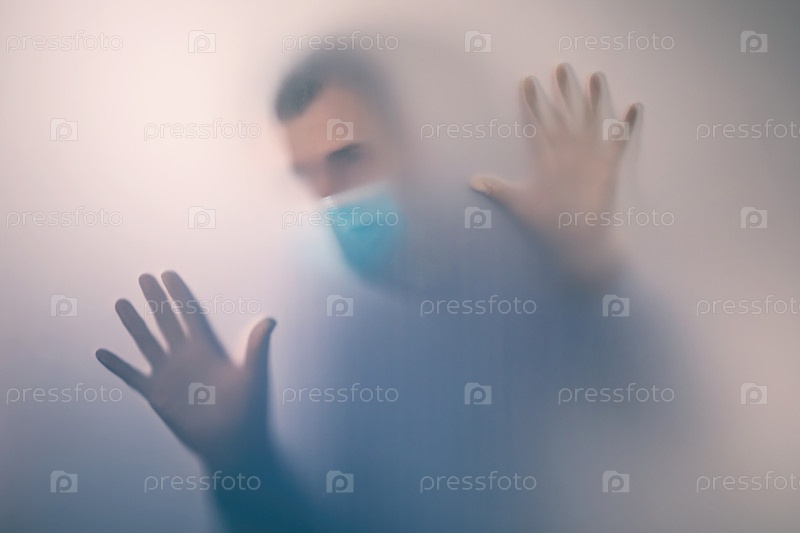 Человек в медицинской маске за матовым стеклом. Концепция на тему карантина в больнице. Расфокусированный фон
