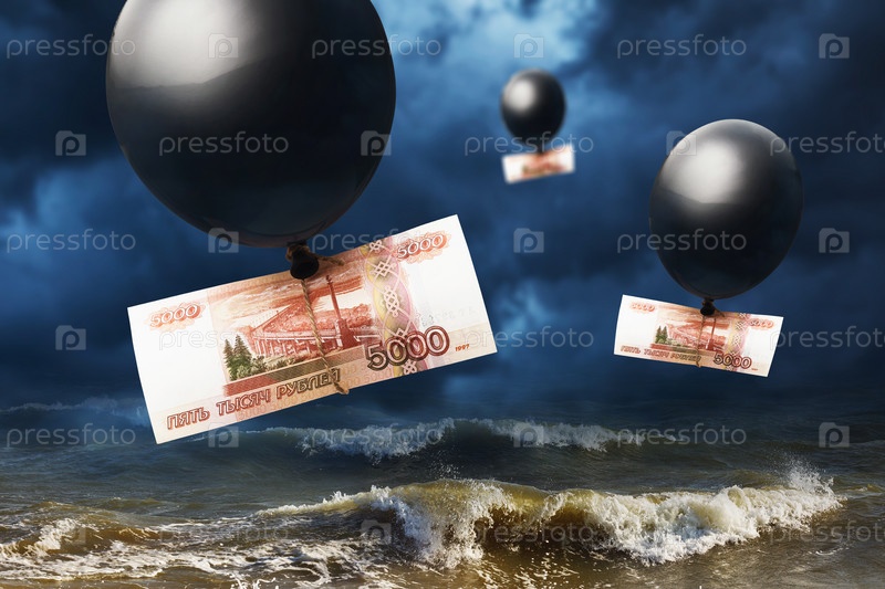 Пять тысяч российских рублей на воздушном шаре на фоне бушующих волн и грозового неба. Концепция падения валюты