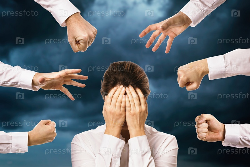 Руки тянутся к человеку, закрывающему лицо на фоне облачного неба. Концепция на тему страха и кризиса в современном обществе