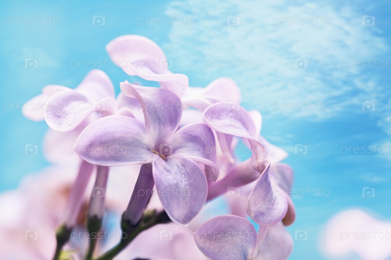 Цветущая сирень на фоне голубого неба, крупный план