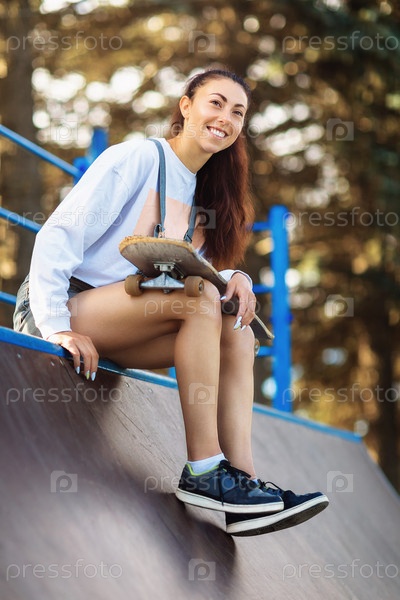 Девушка отдыхает со скейтбордом в руках перед катанием на коньках