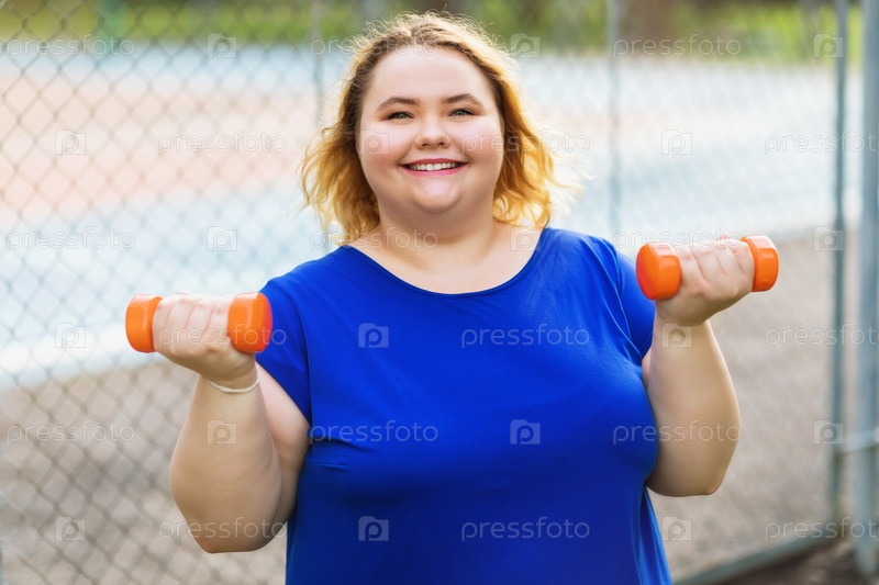Молодая позитивная блондинка размера плюс выполняет упражнения с гантелями на фоне спортивного поля.Концепция здорового образа жизни