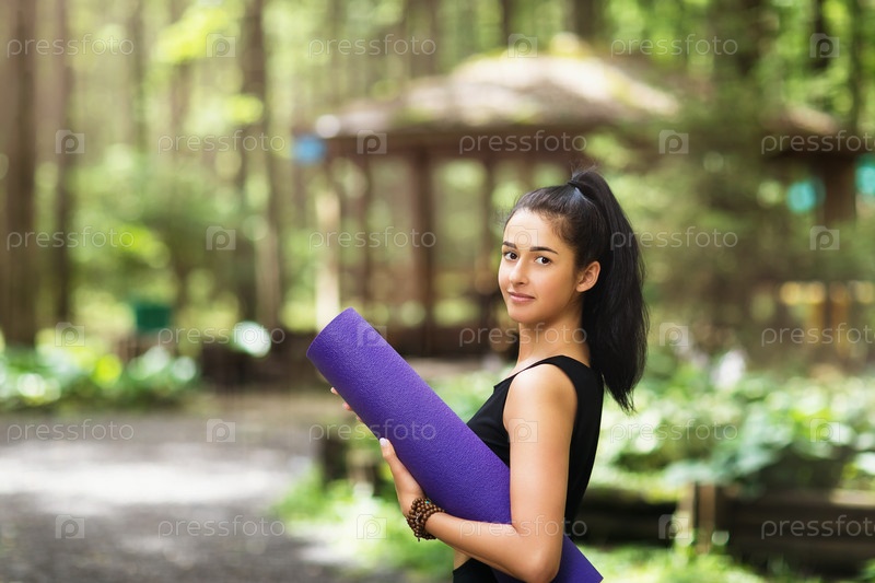 Красивая брюнетка с гимнастическим ковриком позирует на фоне дома йоги. Концепция здорового образа жизни