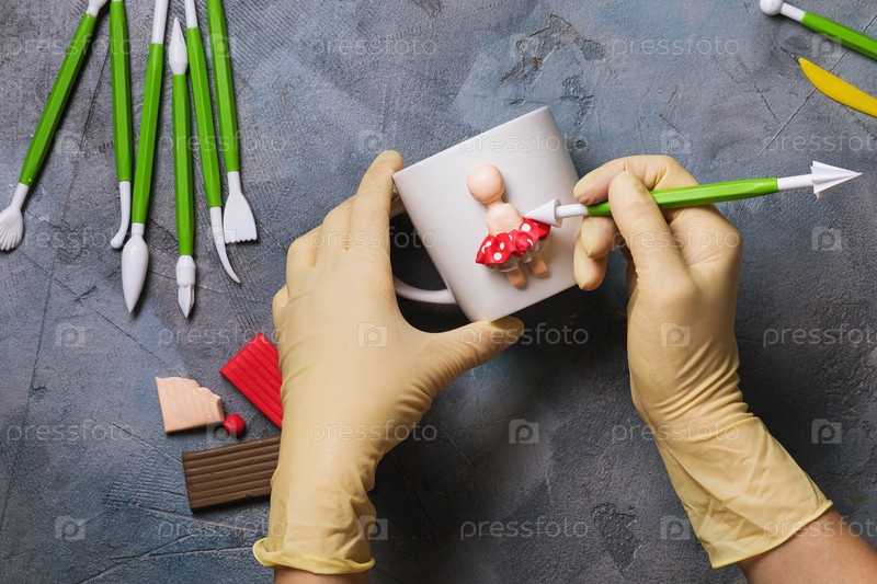 Мастер делает фигурку человека на кружке из полимерной глины, вид сверху
