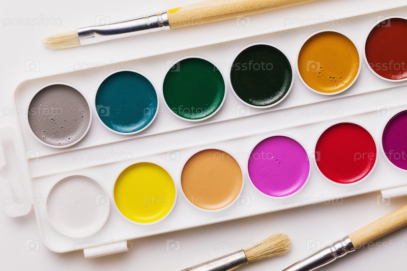 Набор акварельных красок и кистей для рисования, вид сверху