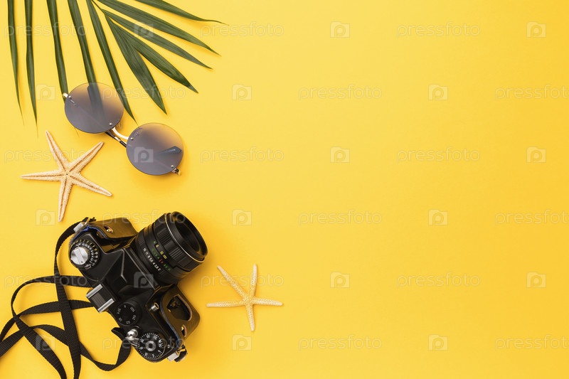 Фотокамера, солнцезащитные очки, морская звезда и пальмовый лист на желтом фоне с копией пространства