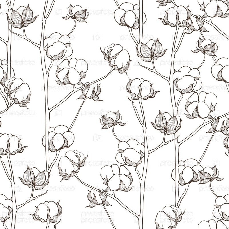 Бесшовный узор с ветвями хлопка. Векторный винтажный фон