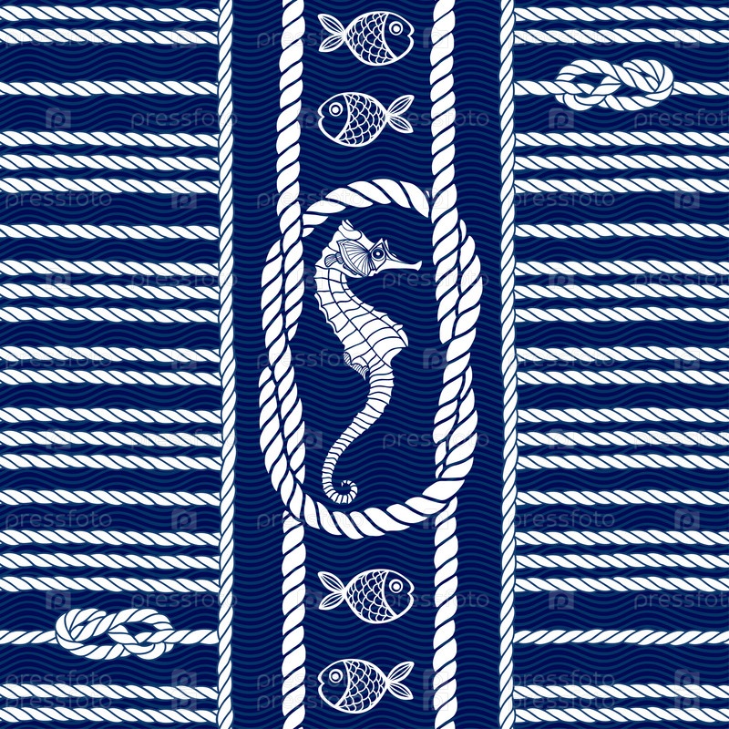 Бесшовный рисунок с морской веревкой, узлами, морскими коньками и рыбами