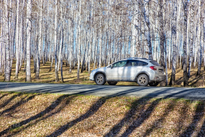 Автомобили едут по шоссе в березовом лесу