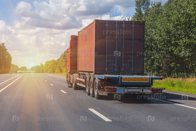 Грузовик идет по шоссе к восходу солнца