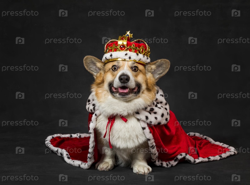 Портрет милого щенка корги, сидящего и улыбающегося на фоне черного изолированного холста в королевской красной мантии и золотой короне