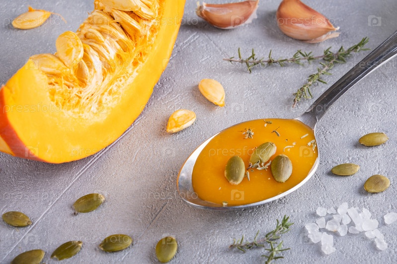 Тыквенный суп с тыквенными семечками и тимьяном в ложке