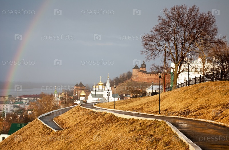 Радуга. Набережная Федоровского. Церковь Ильи Пророка на фоне Нижегородского кремля. Нижний Новгород