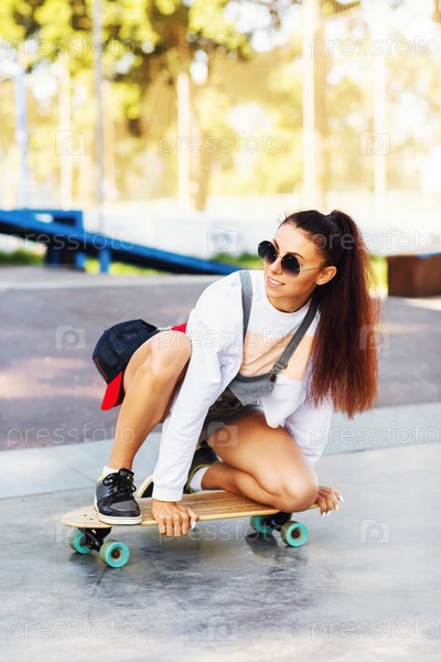 Счастливая молодая женщина в солнечных очках катается на скейтборде в парке