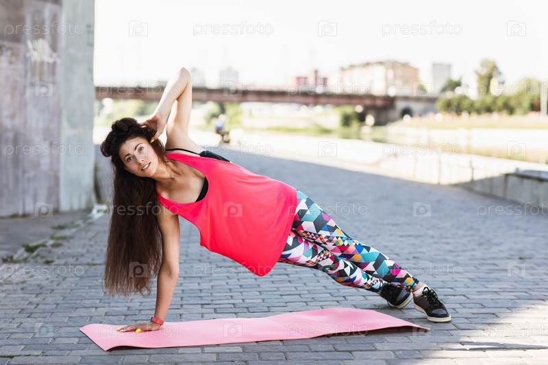 Молодая женщина занимается спортом на набережной солнечным летним утром. Спортсменка выполняет упражнение доски