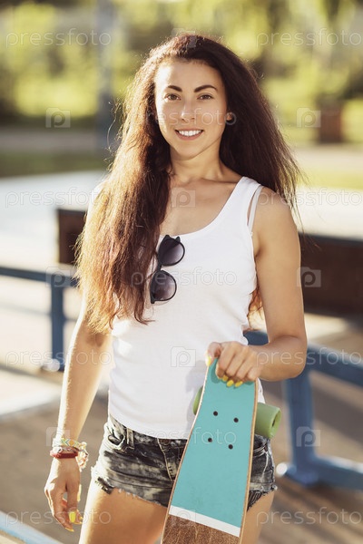 Молодая женщина со скейтбордом в руках на детской площадке теплым летним вечером