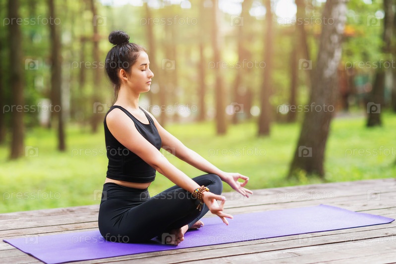 Женщина-тренер в спортивной одежде, практикующая асаны йоги, выполняет упражнение лотоса в парке на деревянном мосту